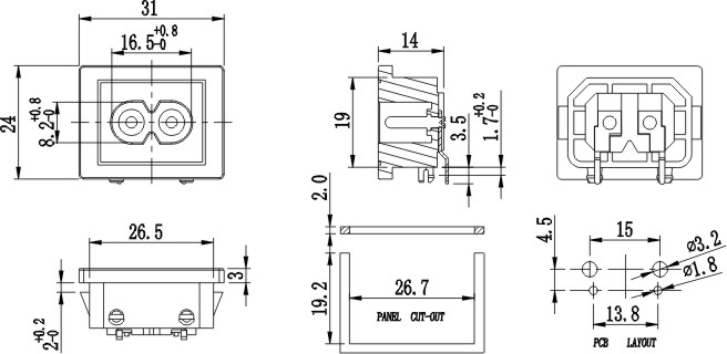 IEC插座系列,小型八字插座,米老鼠插座 ,梅花座等多种规格,产品通过UL VDE CCC CB等认证,常见于家用仪器设备,小家电等